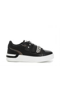 Sneakers en cuir avec déchirures et cabochons décoratifs. Logo en métal à l'arrière et semelle remontante avec insertion métallisée.