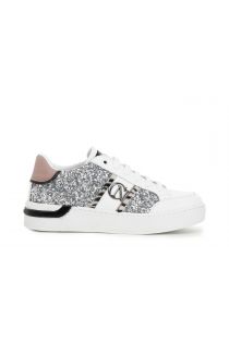 Sneakers en cuir avec insertions avec glitters. Logo en métal sur le côté avec semelle remontante et insertion métallisée.