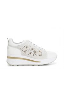 Sneakers en daim avec inserts en cuir et motif de cabochons et de strass. semelle compensée bicolore de 40 mm avec logo gaufré.
