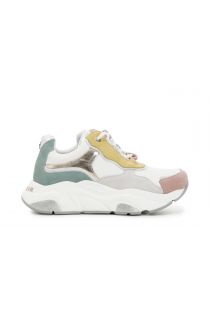 Sneakers avec insertions en paillettes argentées sur la semelle. L’empeigne est en daim multicolore et en nylon La chaîne multicolore personnalisée avec le logo cafènoir participe au laçage et est amovible.