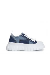Sneakers à lacets en tissu multi jeans effiloché. le bout en caoutchouc décore la chaussure. semelle surélevée de 55 mm décorée d'un motif rayé.