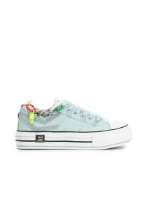 Sneakers en tissu avec des détails enrichis de sequins à l'arrière et accessoire avec chaîne et détails colorés inclus. semelle remontante avec rayures décoratives.