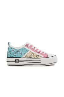 Sneakers en tissu imprimé bandana réalisées avec un patchwork de différentes couleurs et franges décoratives.