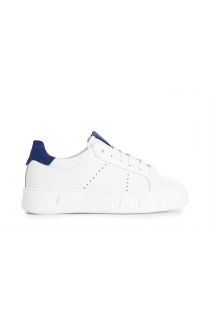 Sneakers homme à lacets en cuir blanc avec petit col bleu. semelle intérieure en cuir.