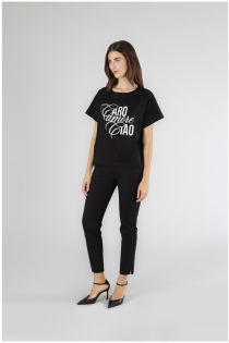 T-shirt à manches courtes et col rond confectionné en jersey de coton. le graphisme reproduit l'écriture "cher amour bonjour" avec des strass.