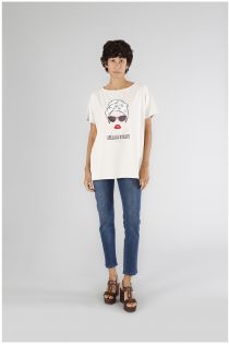 T-shirt oversize à manches courtes en jersey de coton stretch. l'imprimé reproduit un visage de femme et la mention « belle en été ».
