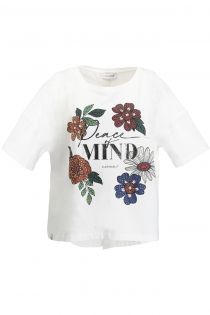 T-shirt à manches courtes en jersey de coton stretch. imprimé floral enrichi de strass de couleur et de lettres pailletées. le modèle ligne confortable et une fente dans le dos.