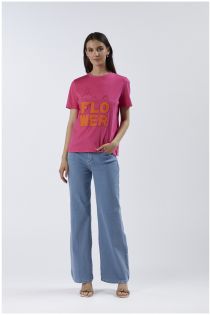 T-shirt basique ras du cou et manches courtes en jersey de coton. le tee-shirt a une impression couleur de notre slogan « be a flower » et des applications de strass de couleur mangue.