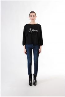T-shirt manches longues chauve-souris en coton stretch avec imprimé floqué "good times" et logo cafènoir brodé.