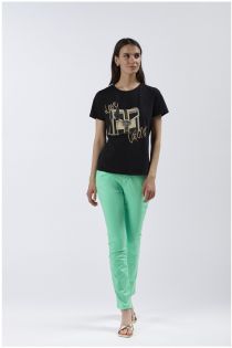T-shirt ras du cou à manches courtes en jersey de coton stretch. il reproduit l'imprimé d'un sac cafènoir orné de strass et de cabochons.