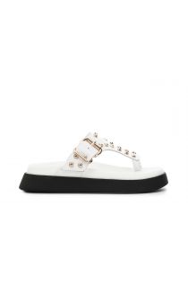Tongs avec boucle en cuir décorée de maxi cabochons carrés à facettes, semelle intérieure confortable et semelle haute.