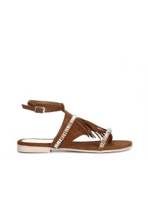 Tongs en daim avec franges et chaîne en strass. la doublure et la semelle intérieure sont en cuir. le talon mesure 2 cm de haut. confortable à porter et facile à assortir.