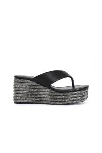 Tong en nappa à semelle compensée avec bandes de strass. la confortable semelle intérieure en cuir véritable rembourrée rend la chaussure confortable même après plusieurs heures d'utilisation. le talon haut mesure 70 mm de haut la plateforme 35 mm.