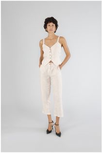 Top sans manches avec boutonnage sur le devant et élastique à l'arrière en tissu de lin à fines rayures. pour un look de bureau parfait à associer avec la veste et le pantalon coordonnés.