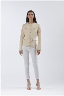 Veste très féminine en similicuir à col ras du cou. poches et fermeture avec boutons dorés personnalisés.