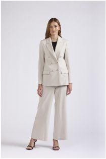 Veste élégante à double boutonnage en tissu stretch. revers classiques et fermeture par boutons dorés. poches passepoilées avec rabats. un vêtement parfait pour une tenue de bureau ou de soirée.