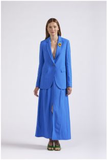 Veste à simple boutonnage en tissu mélangé de lin frais. la veste est agrémentée d'une délicate fleur amovible au crochet. fermeture à un bouton avec poches passepoilées à rabat.