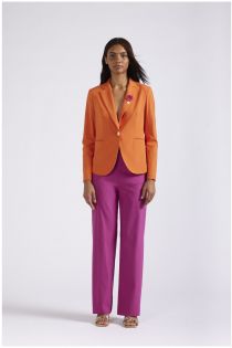 Veste intemporelle à simple boutonnage en tissu superstretch à effet flammé. le col est enrichi d'une fleur amovible au crochet. fermeture à un bouton et poches passepoilées.