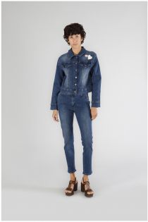 Veste en jean en toile super stretch. fermeture avec chaussons et épingle amovible. vêtement qui s'adapte aux looks total denim et aux occasions décontractées avec des t-shirts et des chaussures plates.